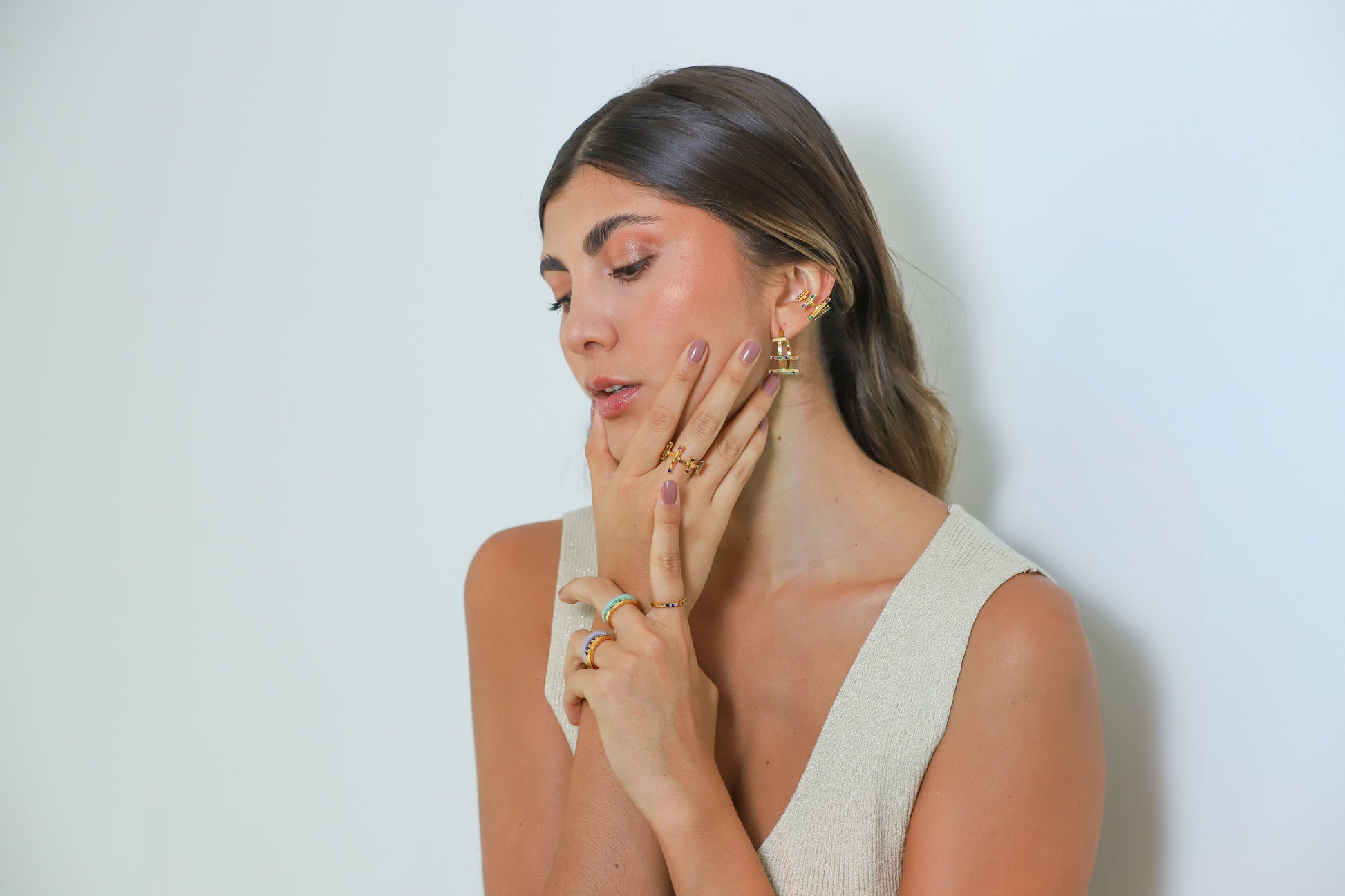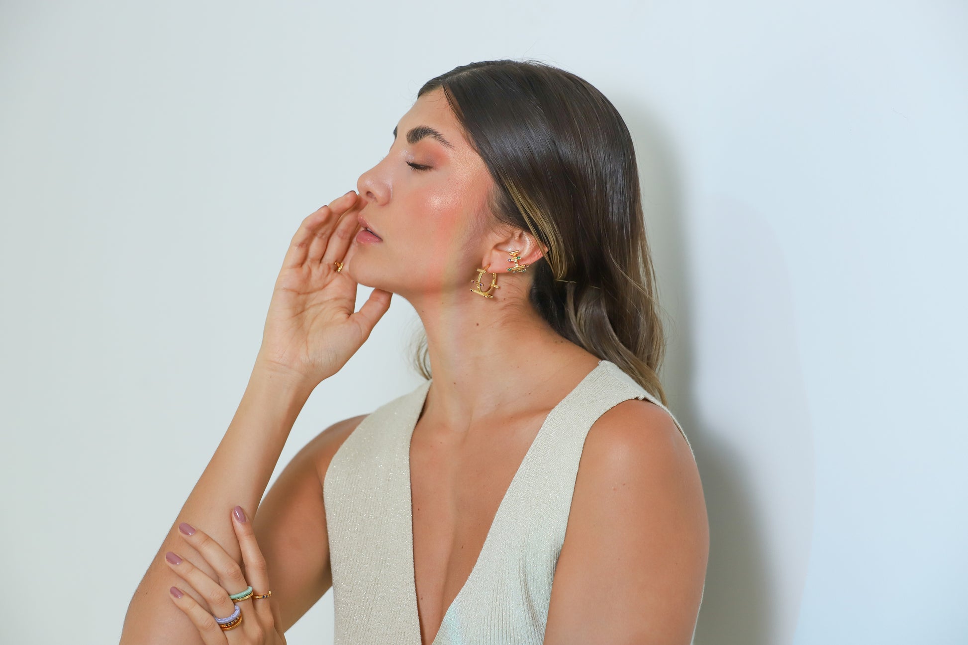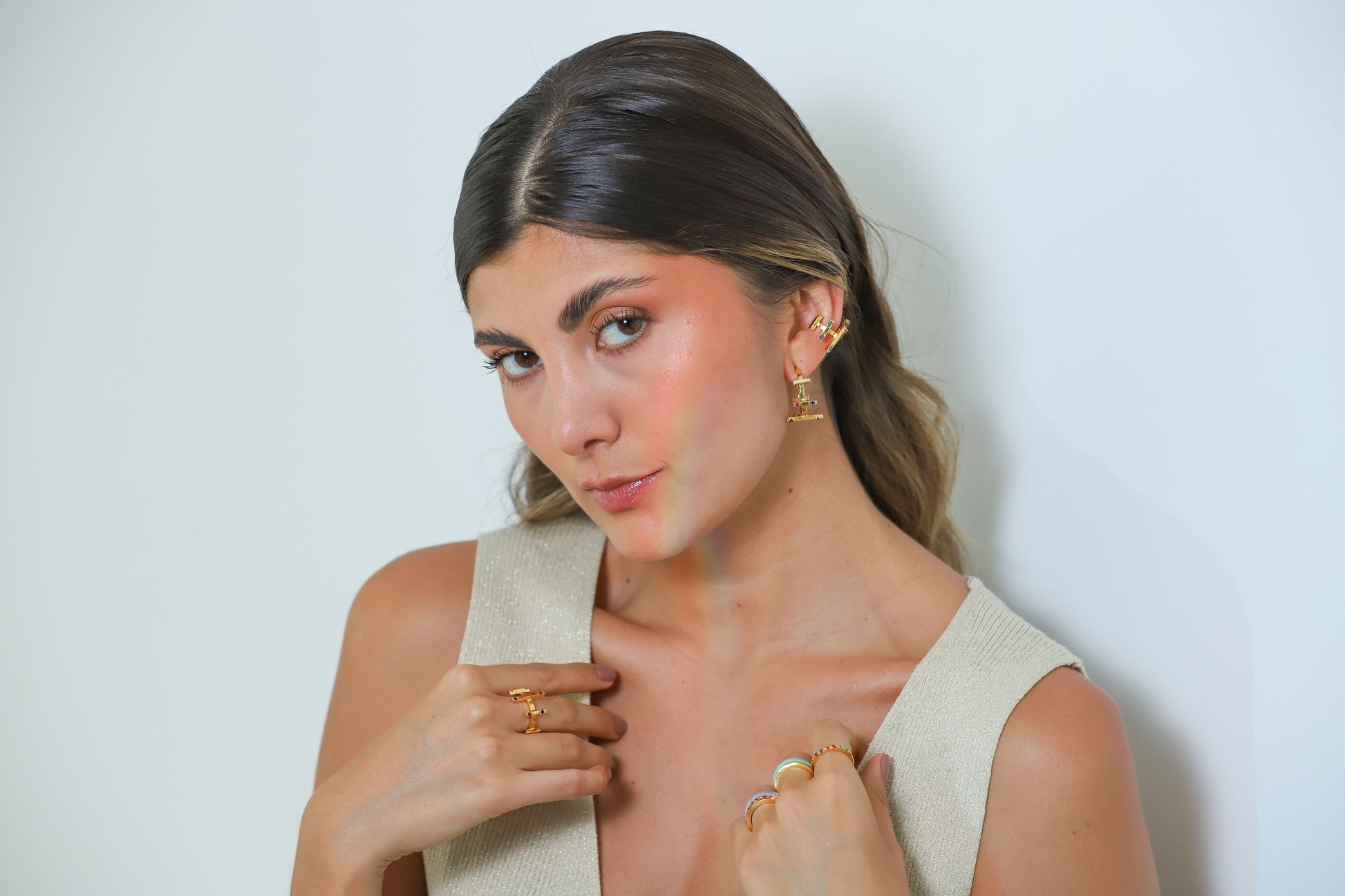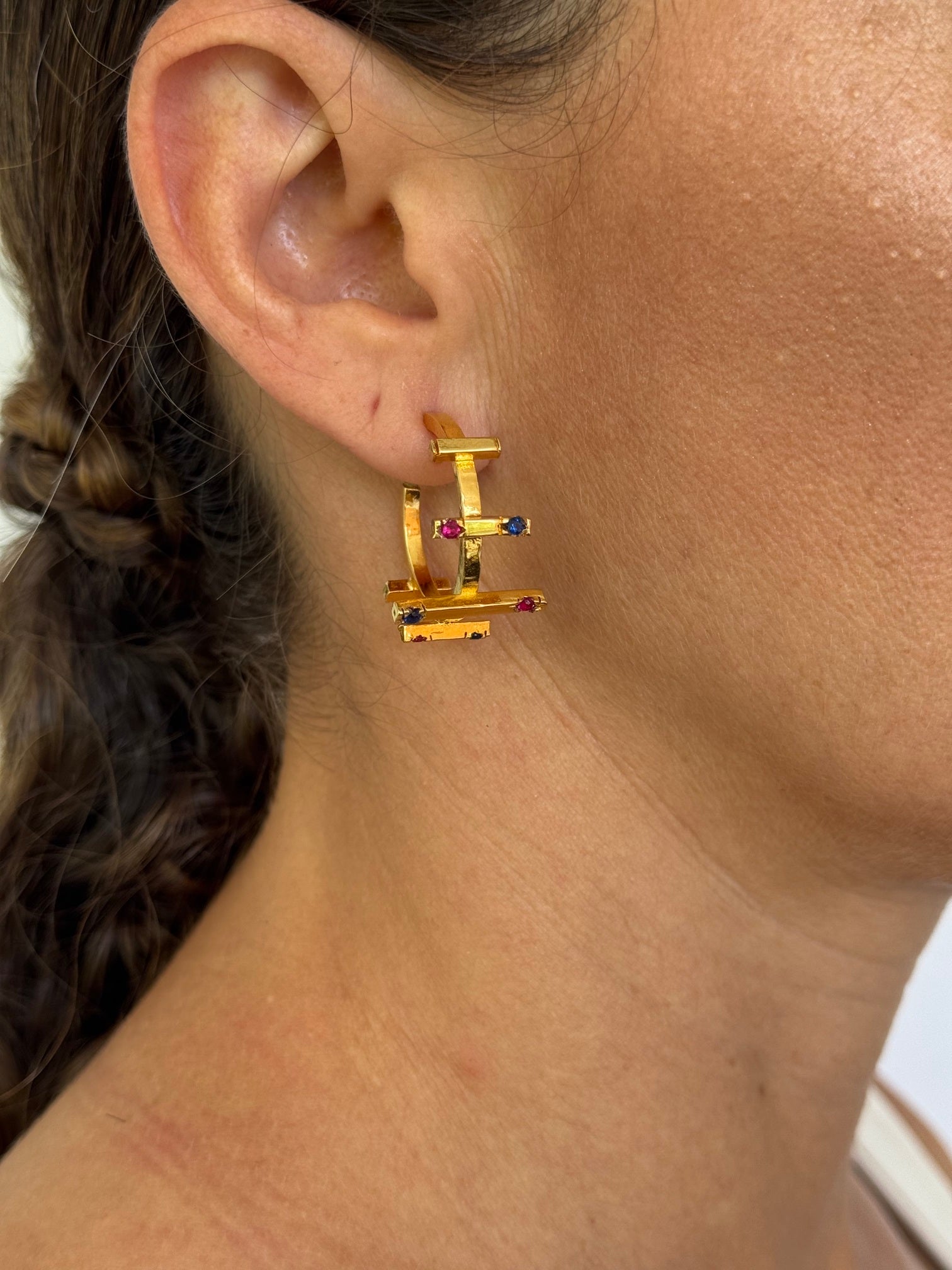 ¡Eleva tu estilo con estas Candongas Entre Paños Circon! Hechos con bronce y bañados en oro de 24K, Tienen una piedra circon brillante para un look elegante y sofisticado. ¡Haz que todos tus atuendos destaquen con estas candongas de alta calidad!