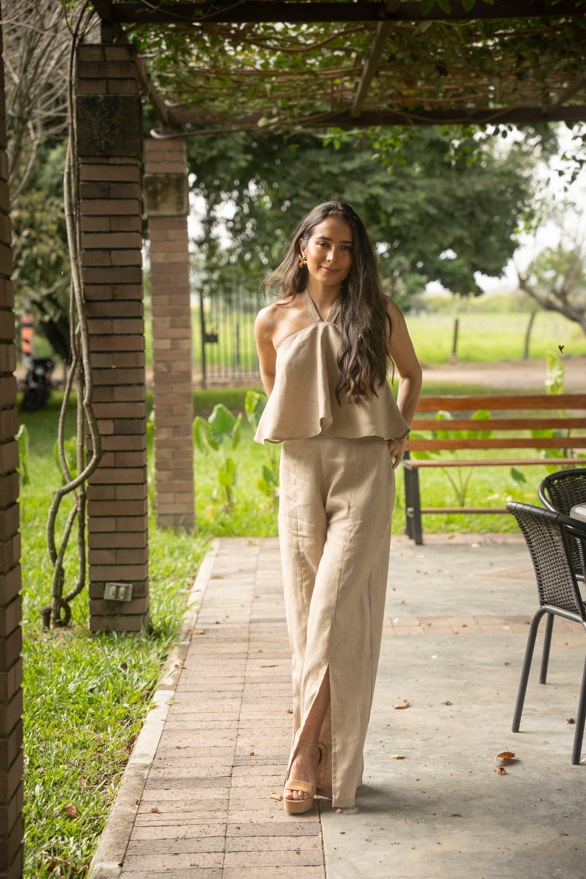 Pantalon bota recta con bolsillos laterales y abertura delantera 100% LINO.