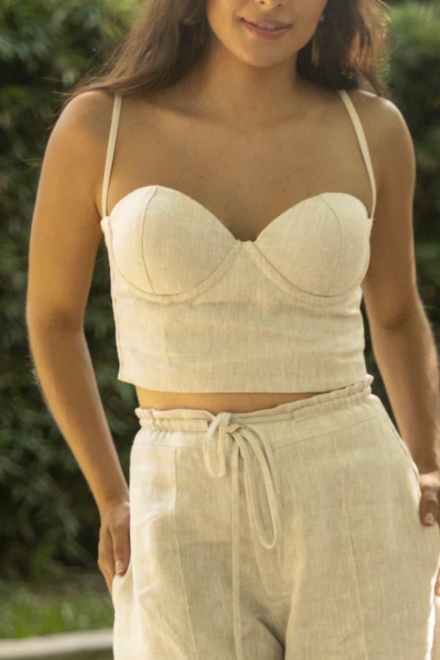 Top con copas prehormadas, resorte posterior, tiras ajustebles y sesgo 100% LINO.