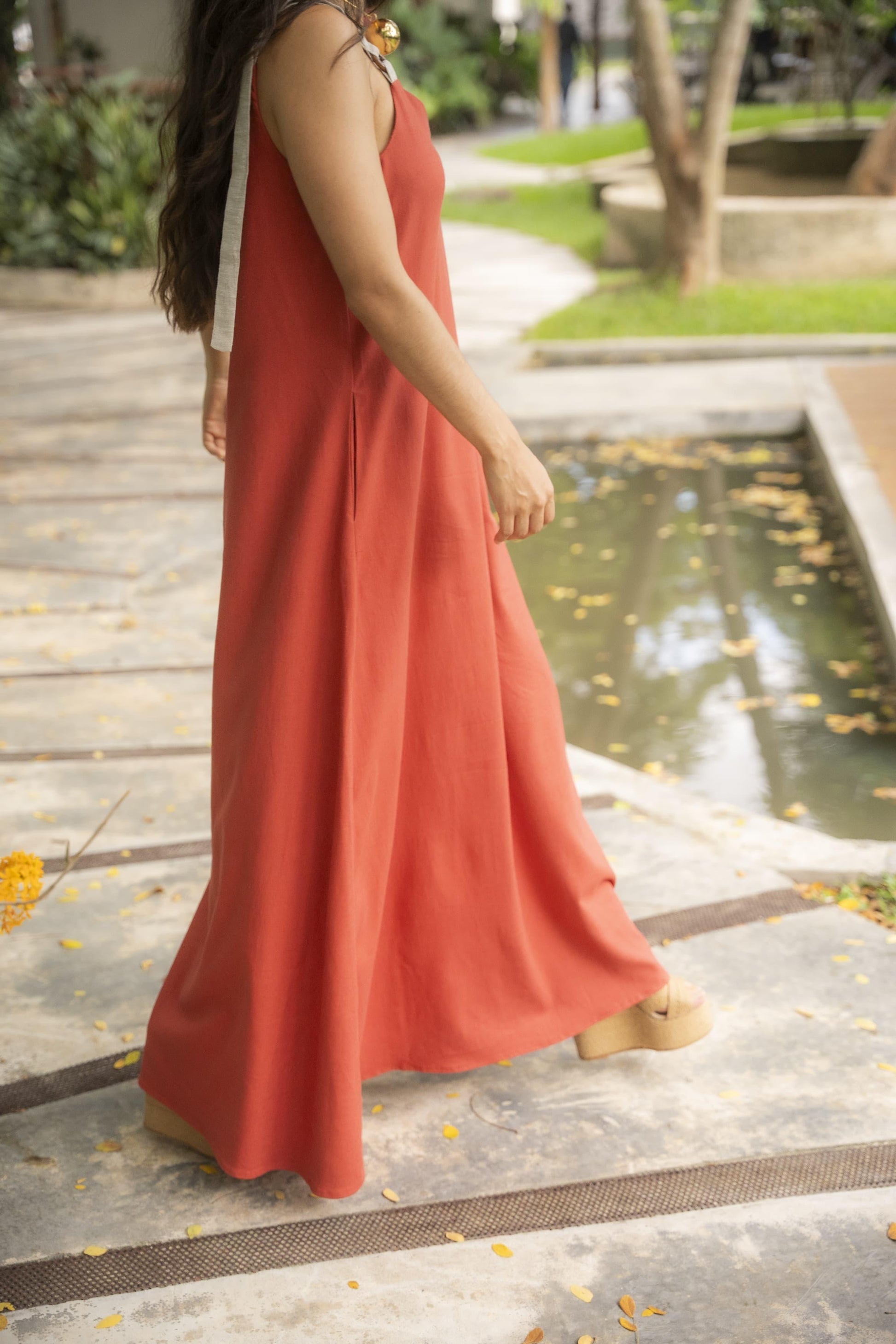 Vestido largo de tiras anchas con contraste de color, con detalle de madera y bolsillos laterales. LINO/ALGODON